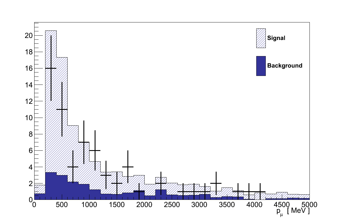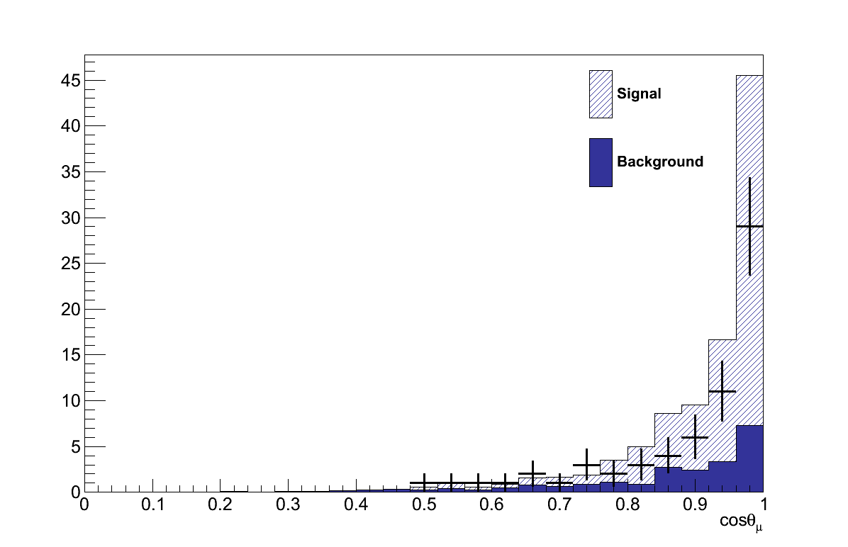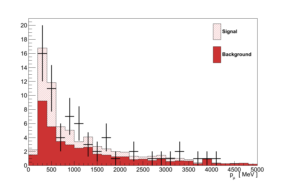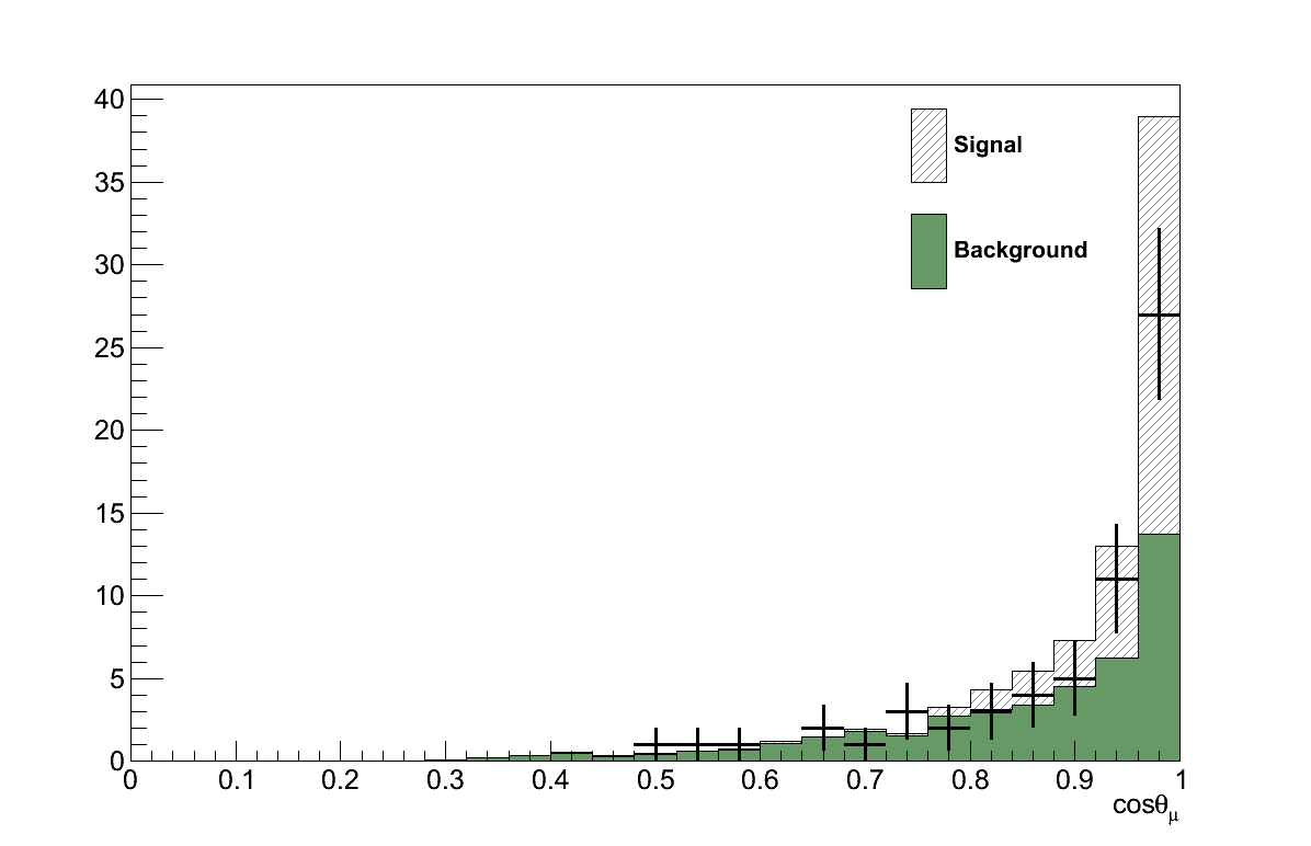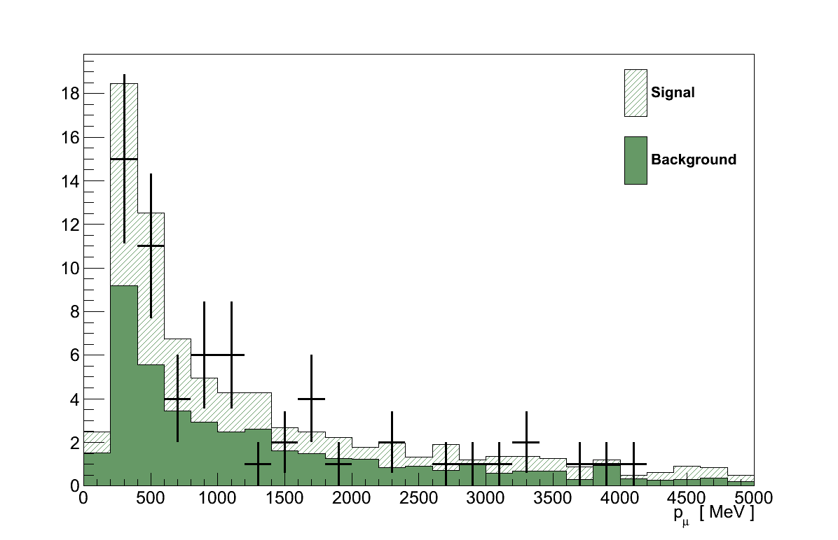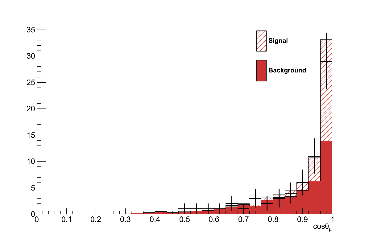 The maximised likelihood, L(μ′,τ′,b′), found in the result calculation gives the values of μ and τ which best describe the data, i.e the best-fit signal-strength 4. For the GENIE simulation this is found at μ′ = 0.92 +0.34-0.36. In other words, the Rein-Sehgal model in GENIE would best describe the data if its cross-section were 92 % of the default.