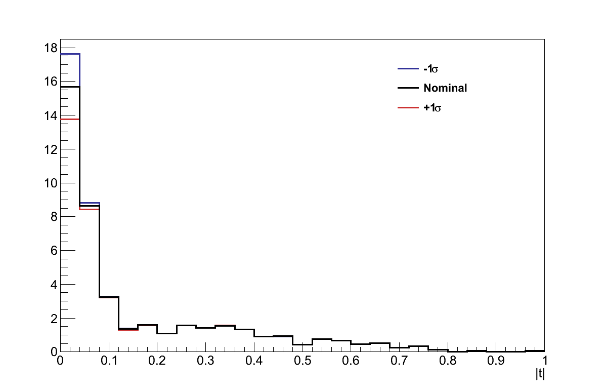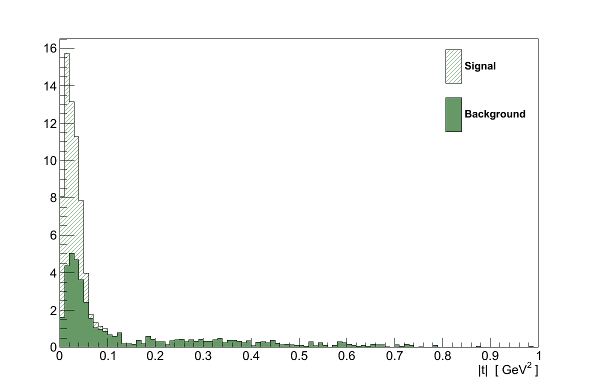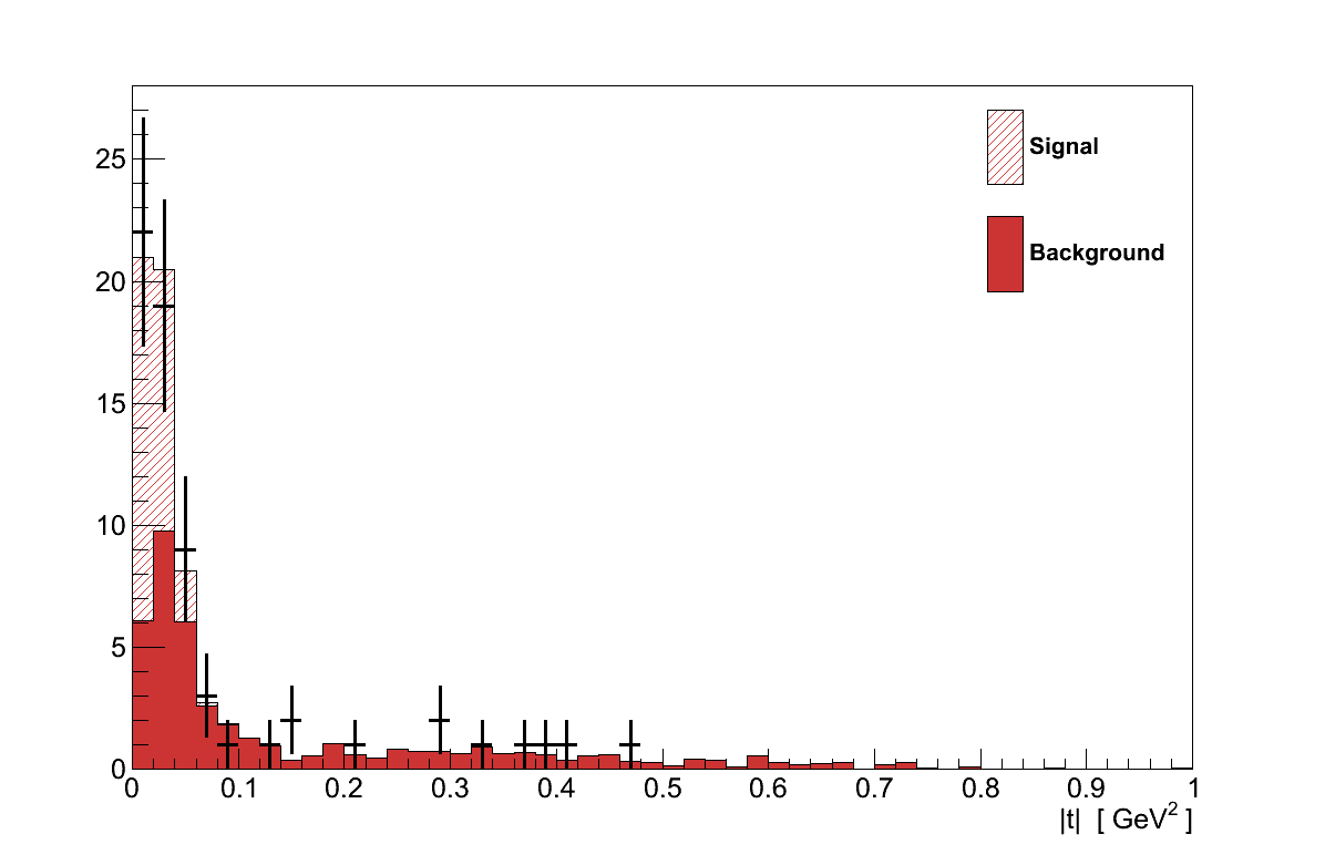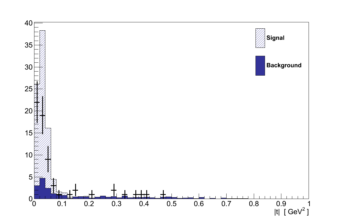Figure 6.27 shows the |t| distribution for events selected in data and simulation. In the signal region, |t| < 0.09 GeV2, there are 53 events in data, compared with a prediction of only 25.3 background events from simulation. In the control region there are 12 data events, compared with 17.6 in simulation.