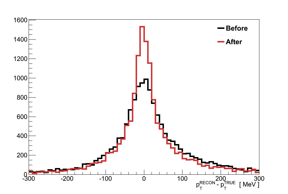 The last correction applied to the simulation compensates for the observation that the reconstructed momentum resolutions in data and simulation do not match.