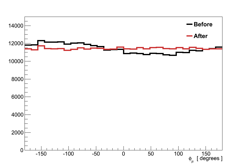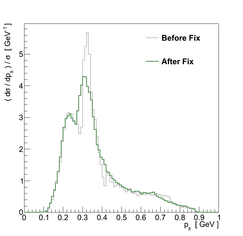 For each of these samples, a 2D histogram of pion momentum verses angle was made, and the ratio between fixed and unfixed versions is taken to give a weight by which the interactions from simulation are corrected.