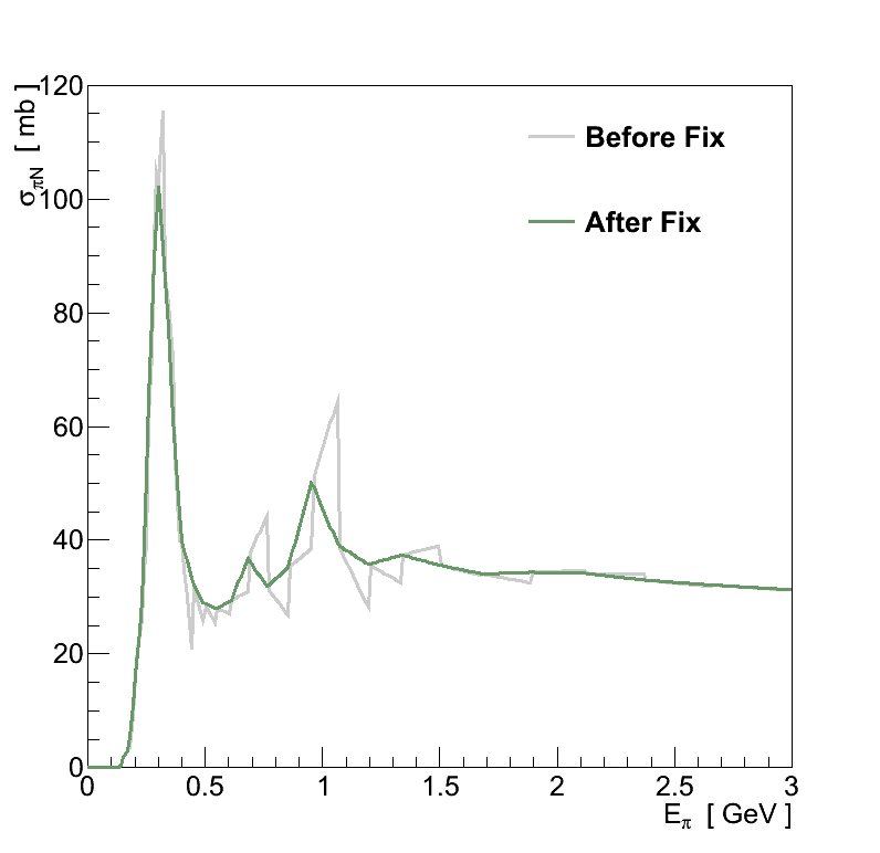For νμ CC coherent pion interactions in FGD 1 a correction is applied to compensate for a bug in the Rein-Sehgal coherent pion production model implemented in versions of GENIE ≤ 2.8.0 (there was a bug in the interpolation of the pion-nucleon scattering cross-sections, see Figure 6.1).