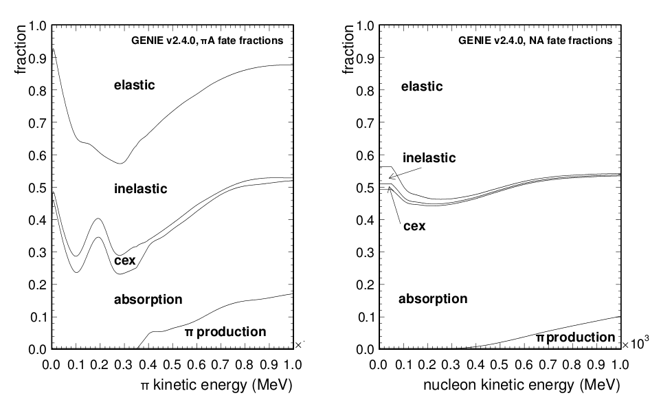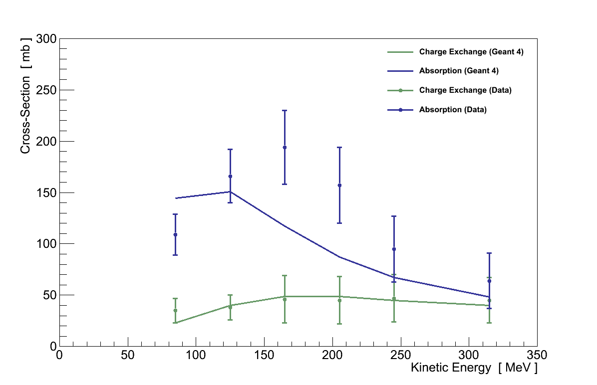 Another potential systematic difference between data and simulation is in the passage of charged pions through dense matter, such as the scintillator of FGD 1. There is evidence to suggest that the cross-sections for interactions which would prevent a π+ from leaving FGD 1 are not well simulated by GEANT4, which is used in the ND280 simulation. The interactions which could most directly prevent a π+ from leaving FGD 1 are absorption (where the pion is captured by a nucleus) and charge exchange (where a nuclear interaction results in the π+ being replaced by a π0).