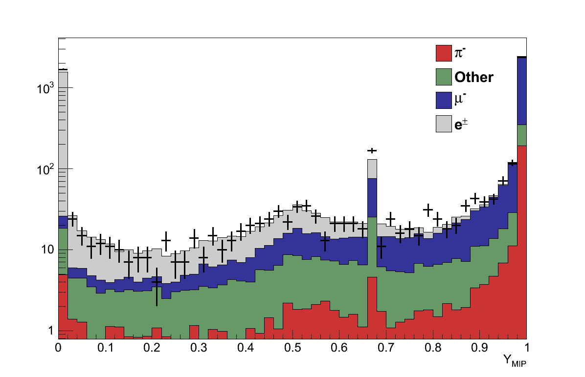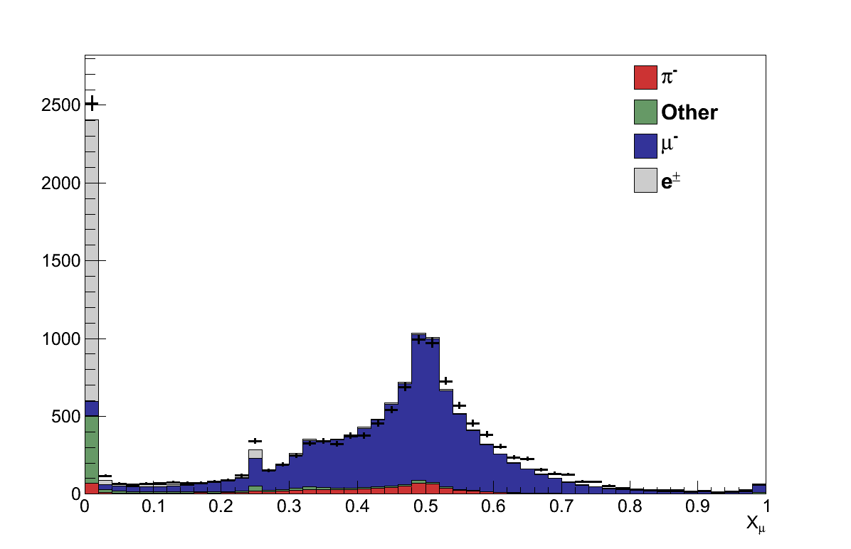 Cuts are then applied using these discriminators calculated for the muon candidate. For events where the candidate has momentum ≥ 500 MeV the event is rejected if Xμ ≤ 0.05. For events where the candidate has momentum < 500 MeV the event is rejected if Xμ ≤ 0.05 or YMIP ≤ 0.8 (Figure 6.5).