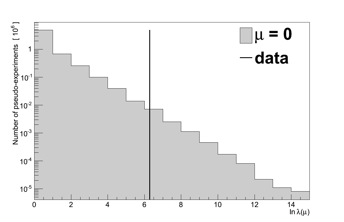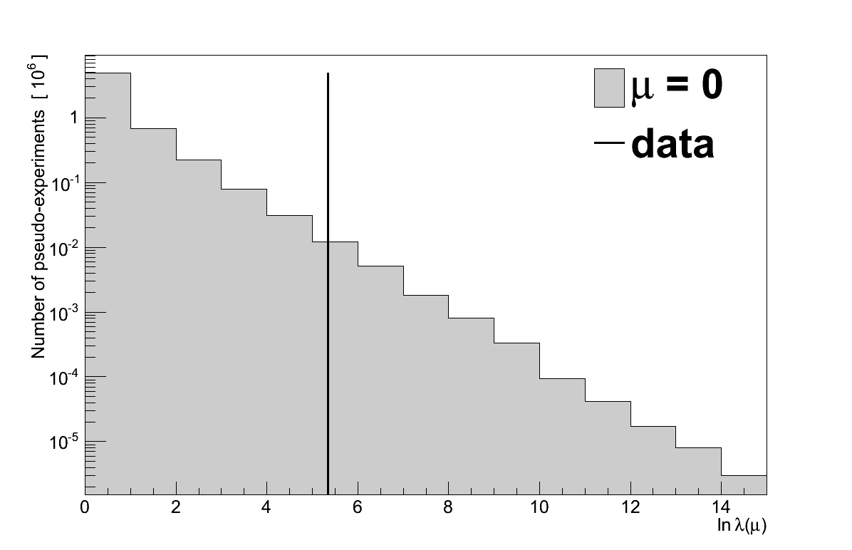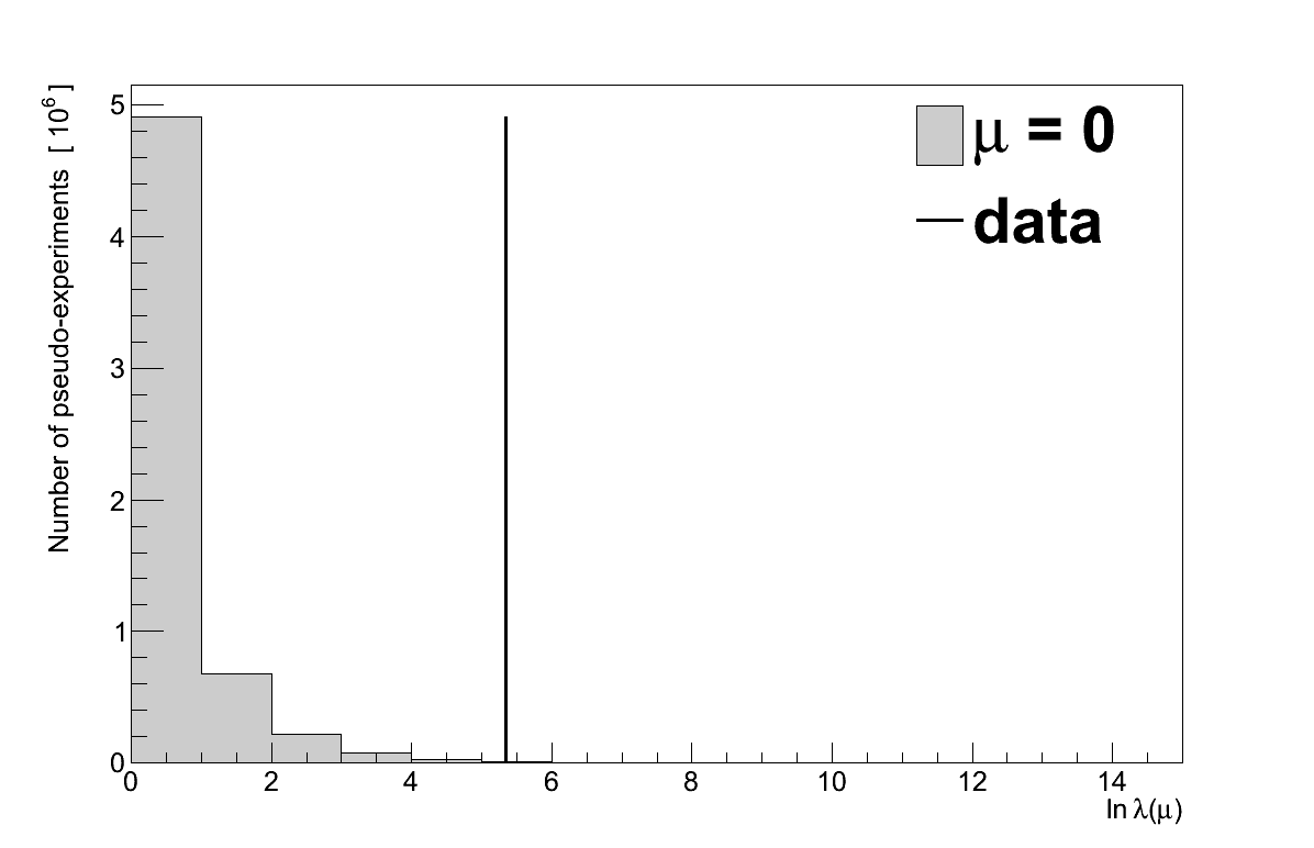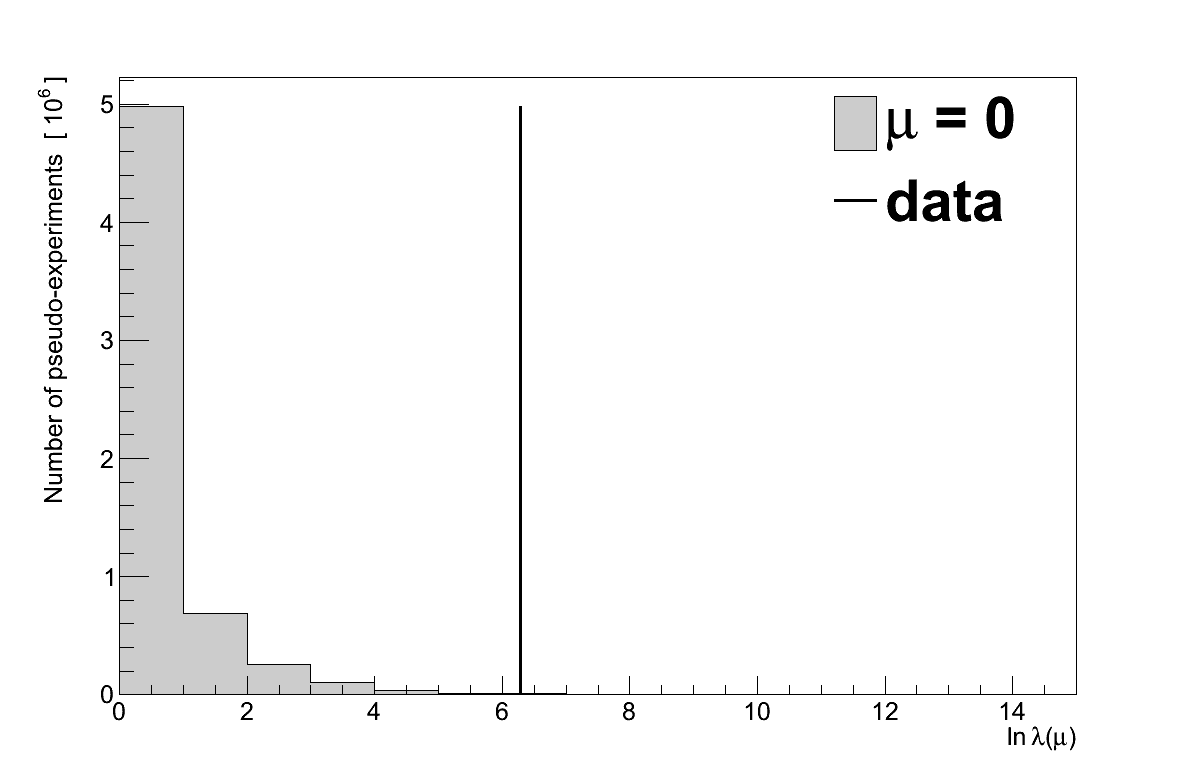 In 13371 pseudo-experiments the value of ln λ(0) was ≥ 5.35, giving the data a P-value of 0.00134. Converted to a significance, that corresponds to a 3.003 σ excess.