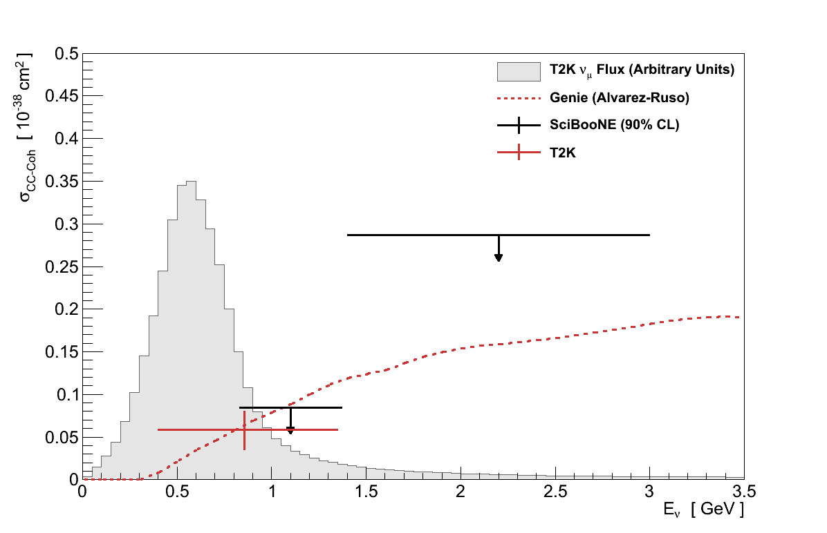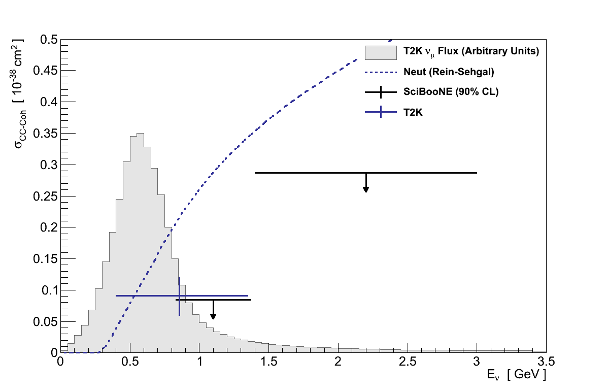 Scaling the GENIE Rein-Sehgal model by this factor gives a cross-section, averaged over the ND280 flux, of 0.060 × 10-38 cm2. As can be seen in Figure 6.29, this is compatible with the 90 % CL limits set by SciBooNE, though the validity of any such comparison is limited by the fact that the two analyses used very different simulations for both signal and backgrounds.