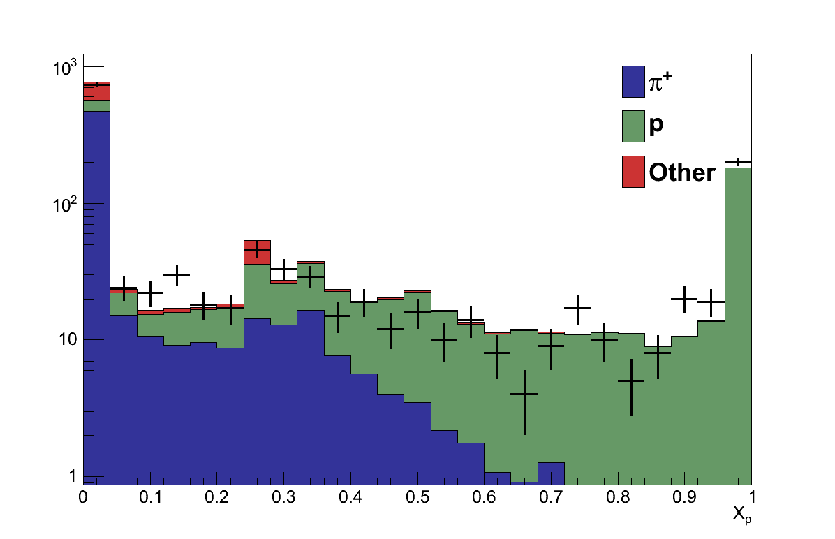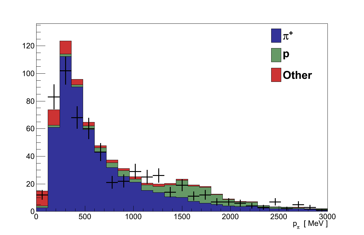 Thus far the focus of the selection has been on finding signal events, those containing just a muon and a pion, rather than removing any backgrounds. As can be seen in Table 6.3, the primary cause of failure of that goal is in mis-identification of the candidate pion track. The biggest single contamination (Table 6.4) is of protons which can be seen in Figure 6.9 to be mostly found at p > 1000 MeV where the TPC PID is less able to distinguish protons from pions (Figure 5.15). Likewise, contaminations of electrons and positrons can mostly be found at p < 300 MeV where again the TPC PID curves overlap.