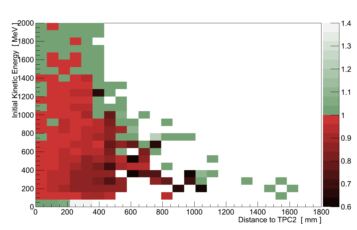 The method for classifying a pion as undergoing charge exchange or absorption followed that defined in the original pion interactions study [16]. Pions were determined to have entered TPC 2 if they were labelled as having done so by the simulation, and all remaining events were classified as other. This final category contains pions which underwent interactions other than charge exchange or absorption which resulted in them not entering TPC 2, or where the simple linear extrapolation was misleading. All of the selected interactions were then binned in 2D histograms, one for each category, according to the initial kinetic energy of the pion, Tinit, and its extrapolated distance from TPC 2.