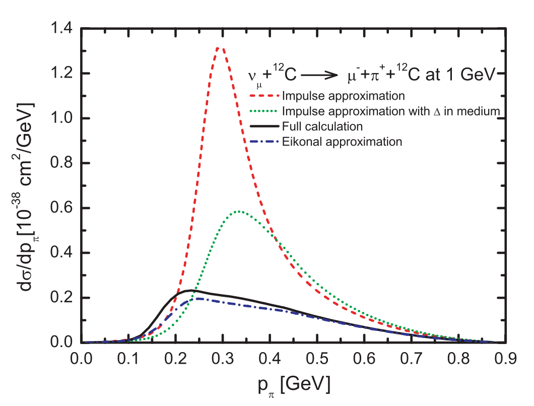 where Π is a pion self-energy which is a function of nucleon density and hence position in the nucleus. This self-energy is calculated using the so called “Δ-hole” model [24], in which pion-nuclear interactions at these energies are dominated by the creation of Δ resonances. While well validated in other scattering fields, the Δ-hole model is only valid for π-N interactions with centre-of-mass energies around the Δ resonance, this limits the Alvarez-Ruso model's validity to Eν < 3.0 GeV.