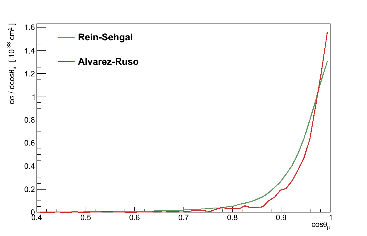 Figure 4.14 shows the total cross-sections predicted by both models. The Alvarez-Ruso model gives a lower cross-section than Rein-Sehgal, which is a first requirement to explain the K2K, SciBooNE and MiniBooNE results. The difference becomes increasingly extreme as the energy increases, though this is also where the validity of the Alvarez-Ruso model drops off.