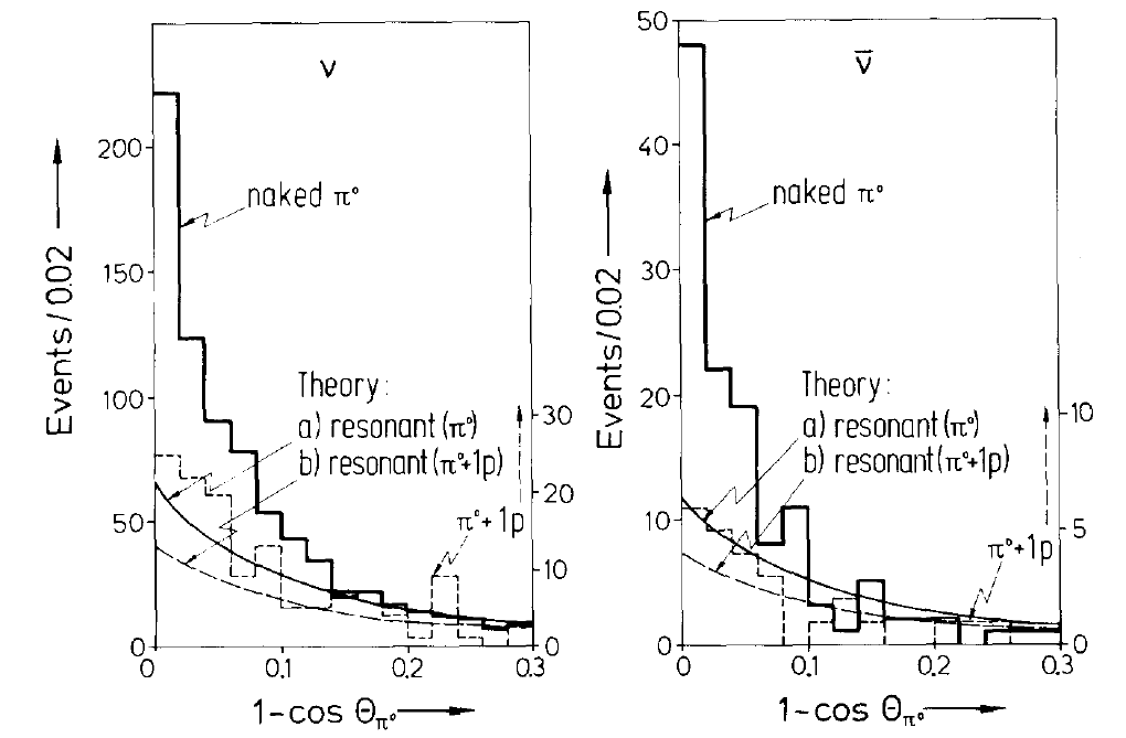 The first observation of coherent pion production was reported in February 1983 by the Aachen-Padova spark-chamber experiment [1] in CERN's PS neutrino/anti-neutrino beam. While studying a sample of solitary π0s produced in their νμ and νμ beams they observed a significant excess of events in the forward-going direction, an excess that was not present in another sample in which the π0 was produced along with a proton (Figure 4.2). They identified this excess as NC coherent pion production: a theoretical description of which had first been published by K.S. Lackner [2] four years earlier in the context of determining the structure of the weak neutral-current.