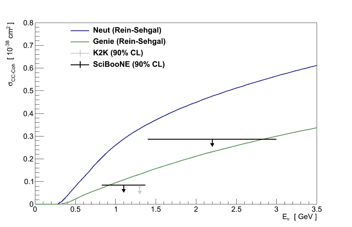 The resurgence of neutrino physics that accompanied the discovery of oscillations at the beginning of the 21st century also brought about a series of experiments at lower neutrino energies than had been studied previously. In stark contrast to previous experiments, K2K's search for CC coherent pion production at Eν of 1.3 GeV found no evidence for its existence. This surprising result was later confirmed by SciBooNE, which also set cross-section limits well below the level predicted by the Rein-Sehgal model implemented in NEUT (the interaction simulation both experiments were using), shown in Figure 4.5. Measurements of NC coherent pion production were successfully made in both MiniBooNE and SciBooNE, but even here the cross-sections reported were a substantial reduction on the values expected from the Rein-Sehgal implementations in NEUT and NUANCE.