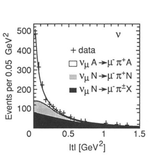 The requirement that the nucleus remain intact and unaffected by this interaction gives rise to several characteristic features of coherent pion production. The first is that the four-momentum transferred to the nucleus must remain small, since any substantial transfer absorbed by the nucleus would excite or otherwise fragment it and break coherence. This is characterised by the kinematic variable, |t|, which is the squared four-momentum transfer to the nucleus, from the neutrino-lepton-pion system: