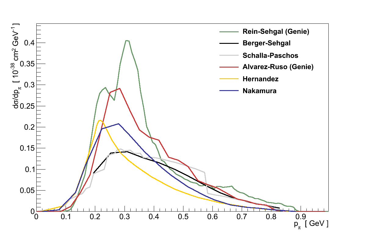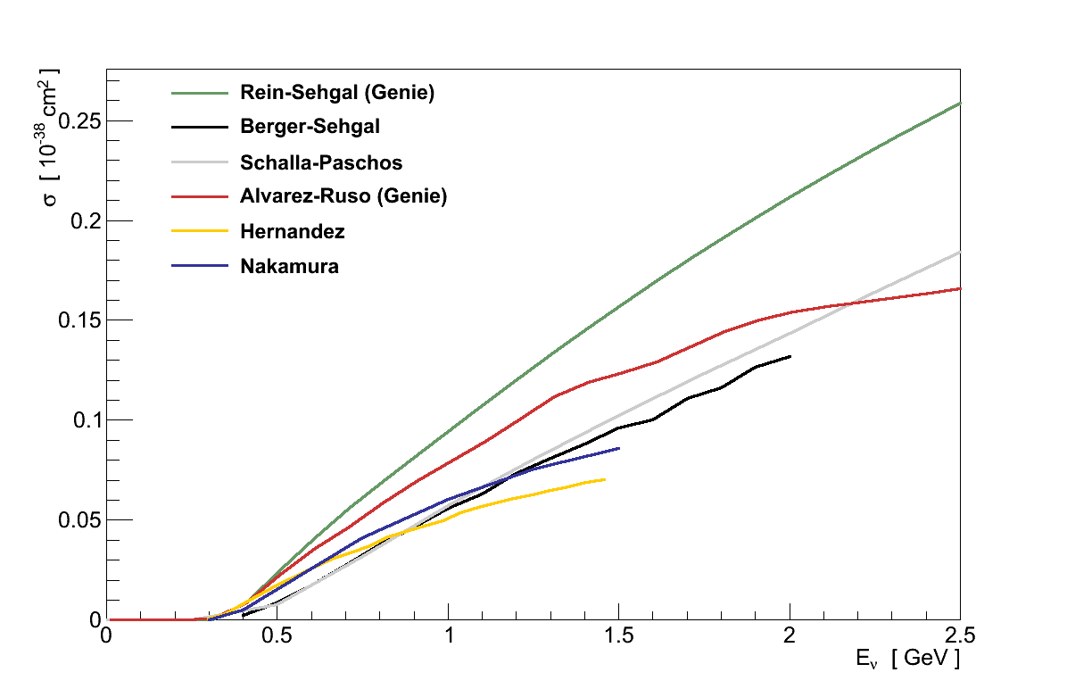 Rein-Sehgal, Berger-Sehgal [19], and Schalla-Paschos [28] are all examples of PCAC based models. Amongst other differences, the latter two implement more realistic descriptions of the pion-nucleus interactions. Hernandez [29] and Nakamura [30] are both examples of microscopic models similar to the Alvarez-Ruso model described here.