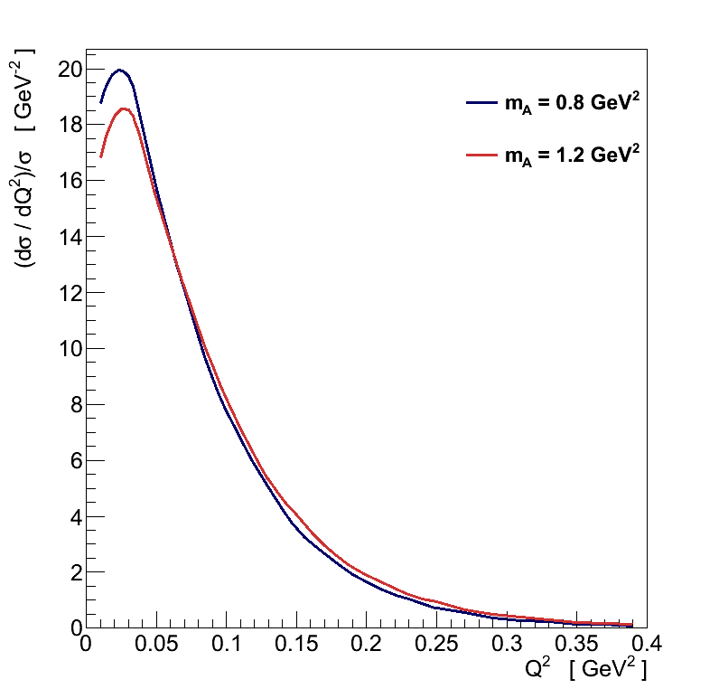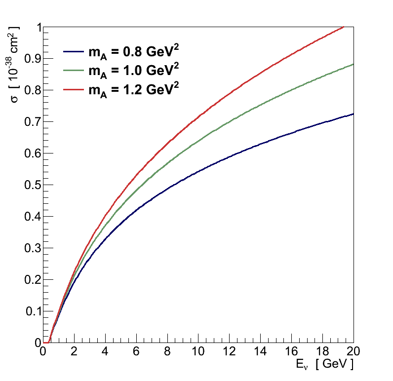 The remaining inputs to the model are more simple to evaluate. The axial mass, MA, mainly scales up the total cross-section, though it does make subtle changes to the shape of dσ/dQ2 (Figure 4.10). Since existing coherent pion production data falls far short of being capable of constraining this value, MA of 1.0 GeV is assumed by all implementations.