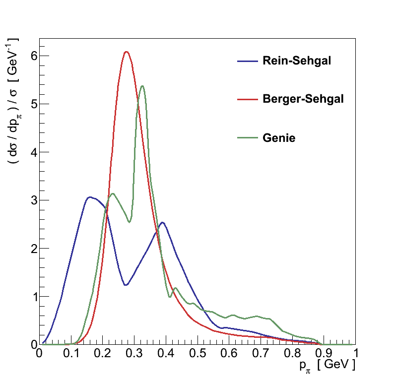 Clearly, there can be large variations in the predictions of the Rein-Sehgal model depending on the choice of inputs used, both in the absolute cross-section and in kinematic distributions (particularly of the pion). It is important therefore, recalling Figure 4.5, when making statements about a measurement's compatibility with the Rein-Sehgal model, to keep in mind what version of the model was used in the analysis. However, even if the Rein-Sehgal model can accommodate the low energy data, it is unlikely to be able to do so while simultaneously maintaining compatibility with data at higher energies (Figure 4.4).