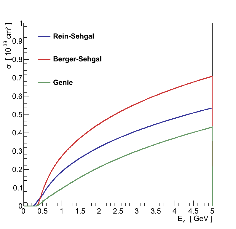 Finally the value of the ℜ/ℑ ratio, r, exclusively scales the differential cross-section. The value of r was not stated in the original Rein-Sehgal paper and different implementations have taken different approaches. For example, GENIE and NEUGEN take the value to be 0.3, while NEUT and NUANCE have implemented r as a function of Eπ. Using the GENIE value of 0.3 implies an increase in the total cross-section of around 10%, which is less than the resolution of the existing data.