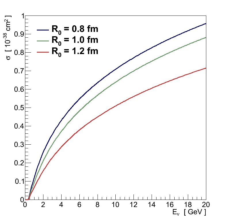 Likewise the dominant effect of the nuclear radius scale R0 (Figure 4.11) is to scale the total cross-section, with larger values of R0 resulting in smaller cross-sections. However, since it appears in the e-R0A⅓|t| term it also affects the shape of the |t| distribution, with higher values of R0 causing the distribution to peak earlier and drop off faster. Although some past experiments have tried alternative values, the original Rein-Sehgal paper and every significant implementation in current use assumes R0 to be 1.0 fm.