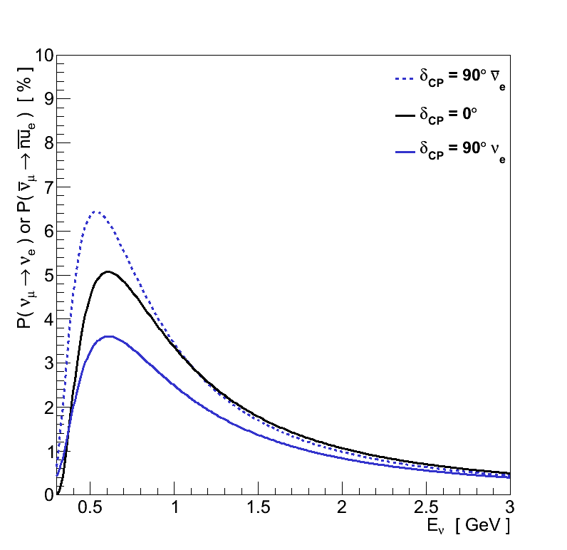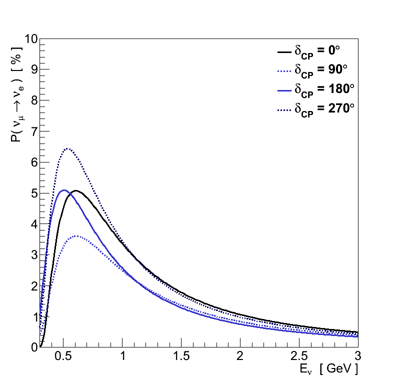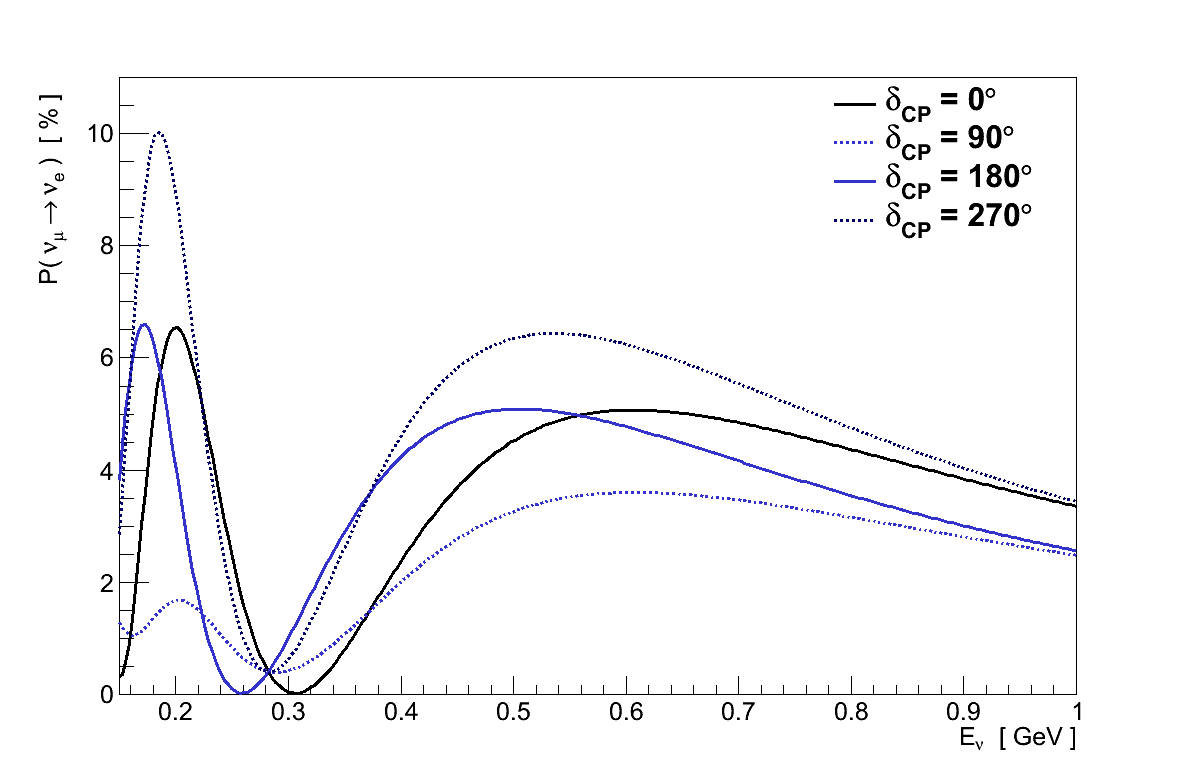 While the other oscillation parameters tend to affect one or other of the amplitude or energy of oscillations, δcp affects both (Figure 2.4). As the value of δcp is rotated, the position of the νe peak varies both in height and energy, traversing a circular path which reaches extremes in amplitude at δcp = 90/270 ° and energy at δcp = 0/180 °. It also affects νe and νe differently, with νe traversing the same circular path but in the opposite direction. Looking at lower Eν (Figure 2.5), equivalent to higher L/Eν, there are additional oscillation peaks which are much more strongly affected by the value of δcp.