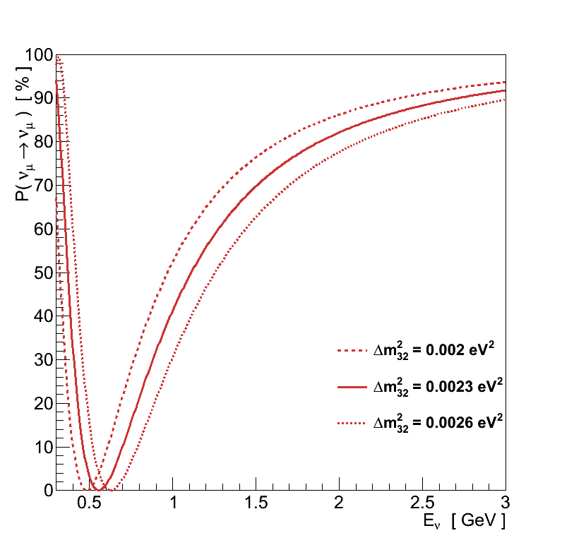 The values of the oscillation parameters then, are determined by measuring the Eν spectrum for a given flavour before and after traversing the baseline. Any deficits/excesses found are the result of oscillations and the energy, size and shape of those changes can be used to measure the oscillation parameters. We can see this by considering the example of an initially pure νμ beam, measured after traversing a baseline of 295 km - approximately equivalent to the T2K experiment (Chapter 5) 4.