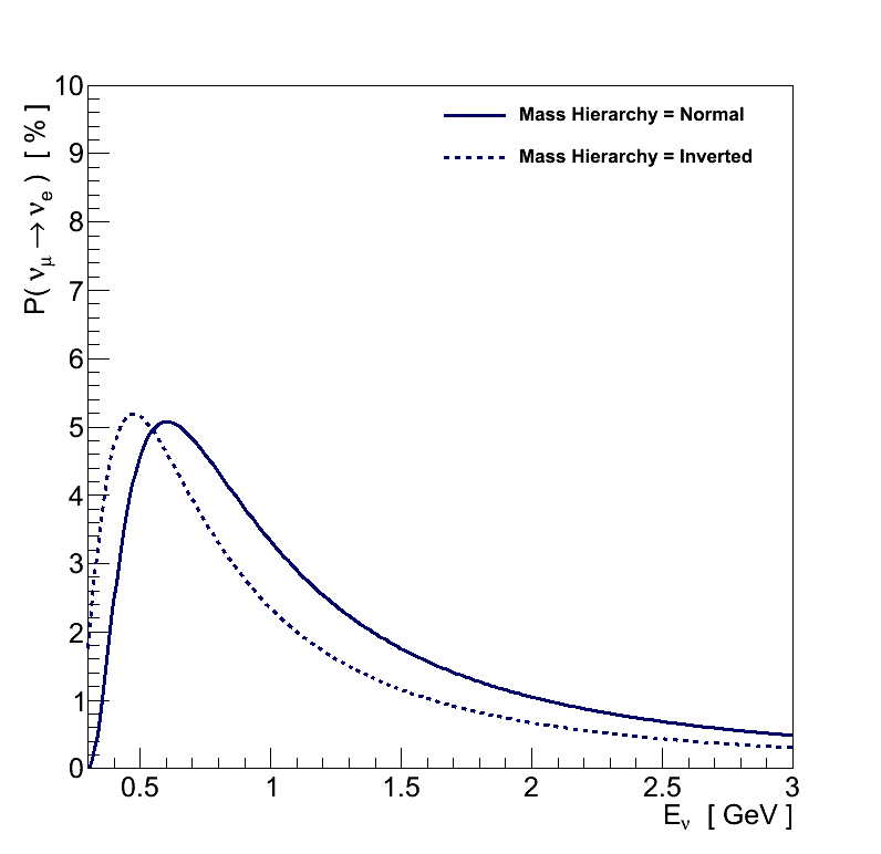 The mass splittings on the other hand affect the energy at which these oscillation features occur (Figure 2.3). The value of Δm232 can be measured from the Eν of the minimum in the νμ spectrum, and the choice of normal or inverted mass hierarchy results in a shift in the Eν of the peak in the νe spectrum.