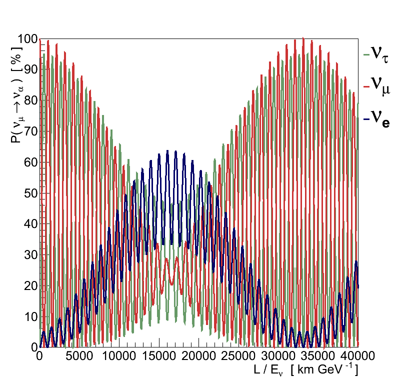 After travelling a distance L through a vacuum the neutrino wavefunction, which was initially pure να, is now a mixture of all three neutrino types and the proportion of each flavour varies as the neutrinos travel. This is neutrino oscillations.