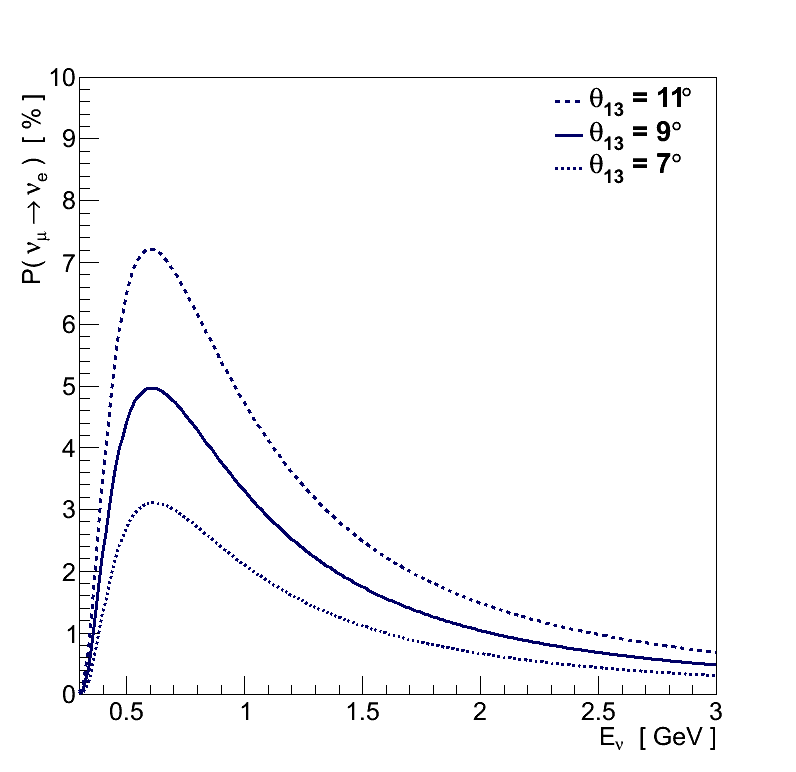Determination of the mixing angles comes from measurement of the amplitude of oscillations (Figure 2.2). For example, the value of θ23 can be determined from the νμ spectrum, where the depth of the minimum resulting from oscillations away from νμ indicates the size of θ23. Likewise, measuring the height of the peak in oscillations to νe allows the determination of θ13.